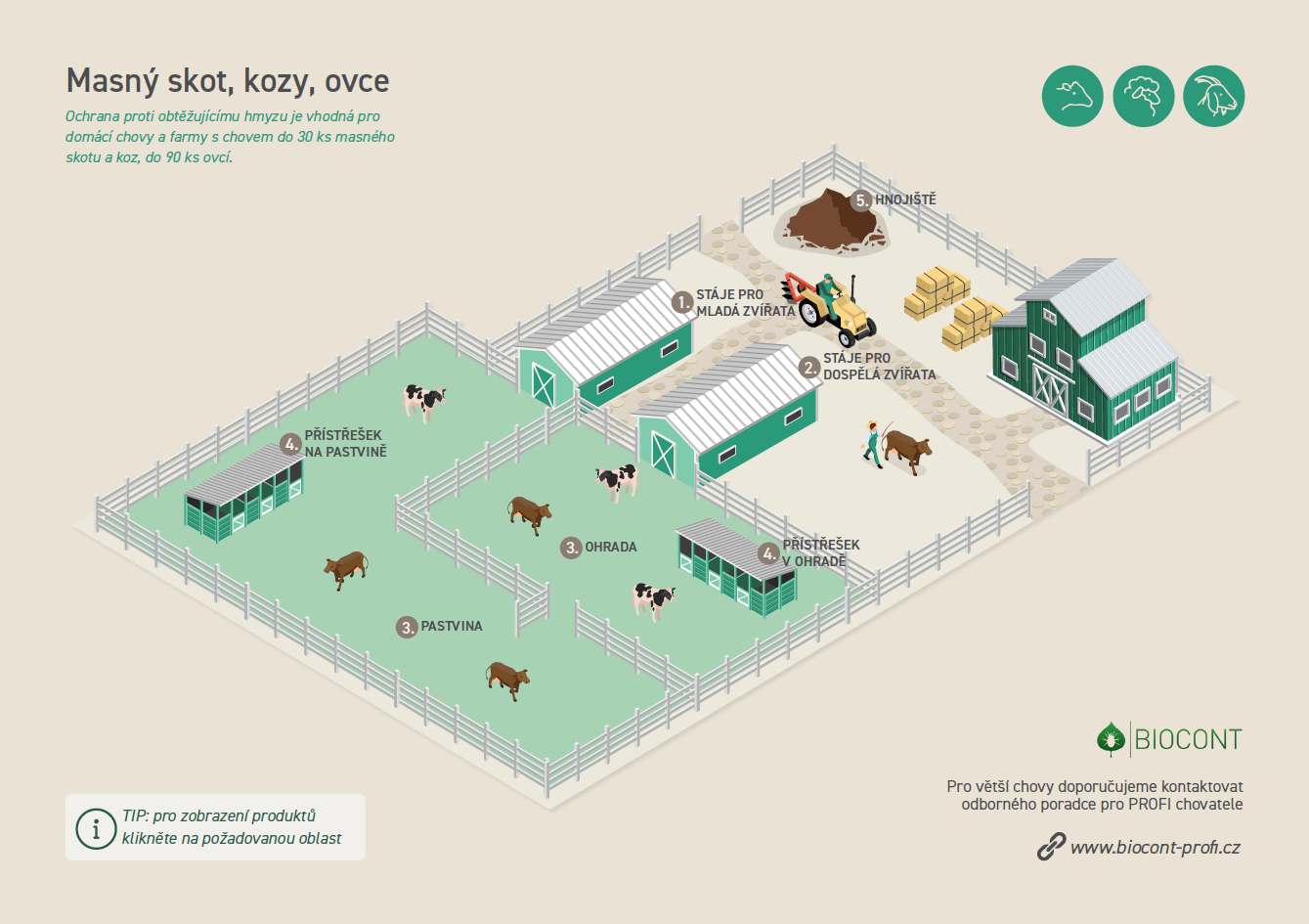 Ochrana proti obtěžujícímu hmyzu je vhodná pro domácí chovy a farmy s chovem do 30 ks masného skotu a koz, do 90 ks ovcí.